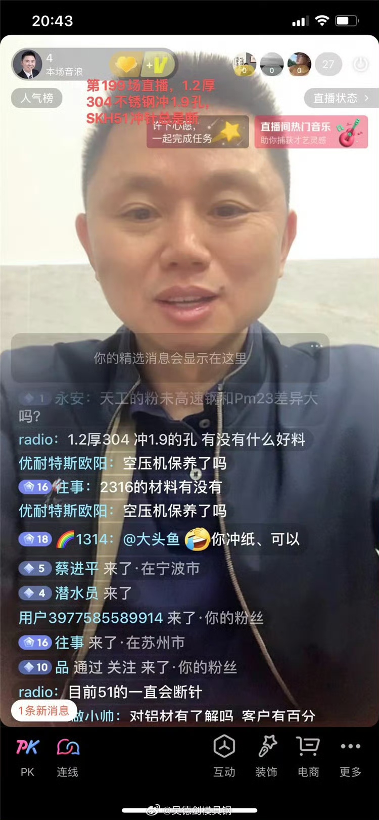 直播间收到网友提问,1.2厚304不锈钢,冲1.9的孔有没有什么好料,目前SKH51的一直会断针。