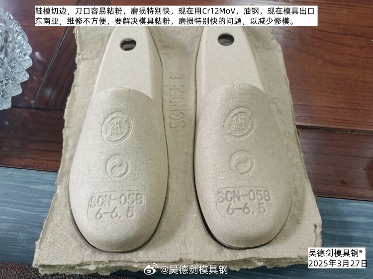 今天下午来了一位用户,他是做鞋模切边的,刀口容易粘粉,磨损特别快,现在用Cr12MoV、油钢,硬度高了容易崩刃,硬度低了容易磨损,而且粘粉很严重,切出来的产品很毛糙。