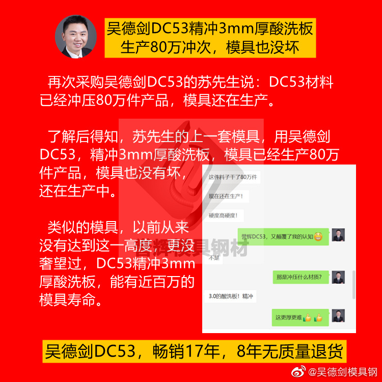 苏先生精冲3mm厚酸洗板,用吴德剑DC53,冲压了80万产品,模具还是好好的,但以前在当地买的DC53,磨损很快。