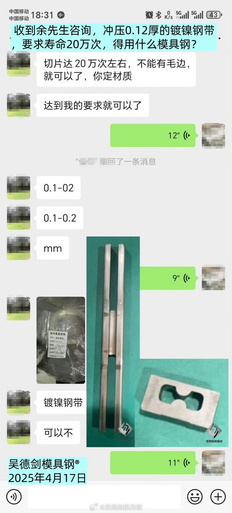 收到余先生咨询,冲压0.12厚的镀镍钢带,要求寿命20万次,冲头和刀口得用什么模具钢?