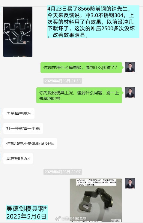 4月23日买了8566防崩钢的钟先生,今天来反馈说:冲3.0不锈钢304,上次买的材料用了有效果,以前没冲几下就坏了,这次的冲了2500多次没坏,改善效果明显。