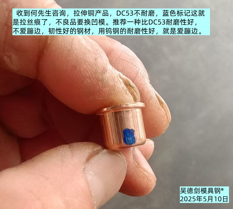 收到何先生咨询,拉伸铜产品,DC53不耐磨,蓝色标记这就是拉丝痕了,不良品要换凹模。推荐一种比DC53耐磨性好,不爱蹦边,韧性好的钢材,用钨钢的耐磨性好,就是爱蹦边。
