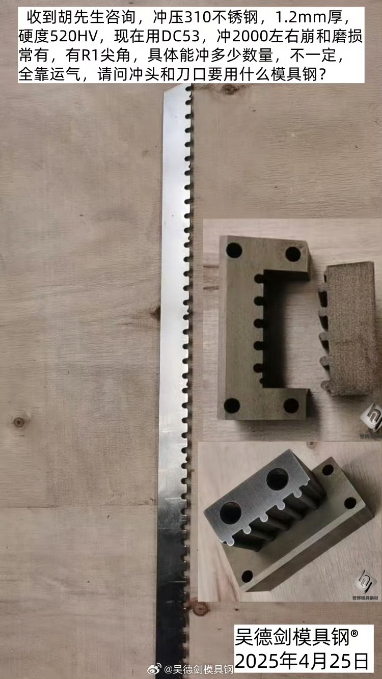 胡先生是他冲压310不锈钢硬料,材料厚度1.2mm,硬度520HV的锯齿产品有R1的尖角,现在用DC53模具钢,只能冲2000次,崩和磨损都有,具体能冲多少数量,不一定,全靠运气,请问冲头和刀口要用什么模具钢?