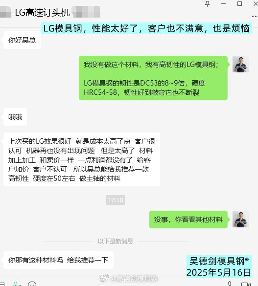 LG模具钢韧性太好,机器不坏,用户满意;可成本太高,加工商不满意,口难调,也烦人。