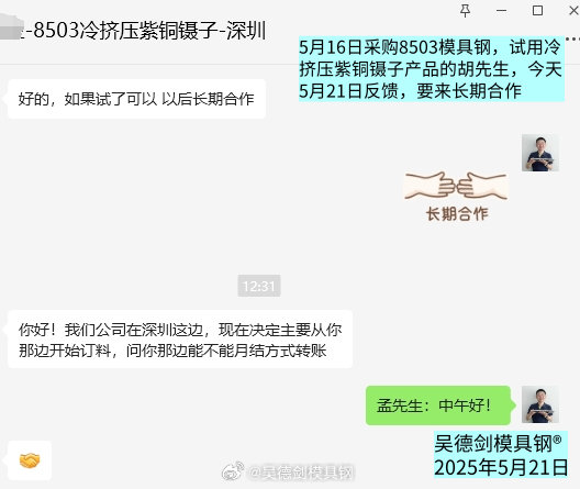 5月16日采购8503模具钢,试用冷挤压紫铜镊子产品的胡先生,时隔5天后的今天来反馈,要来长期合作。