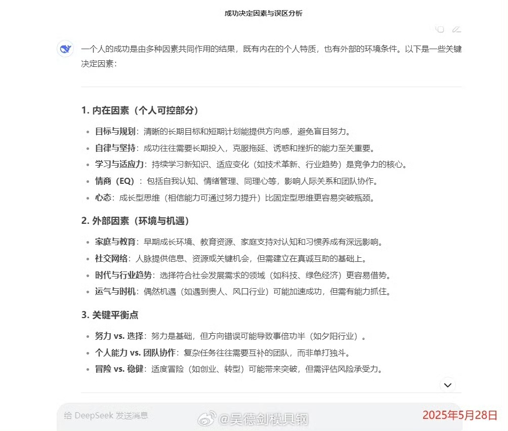 在写这条朋友圈之前,我刻意去问了DeepSeek:一个人的成功由什么决定?