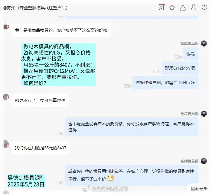 用65块一公斤的8407,不耐磨;推荐用便宜的Cr12MoV,又说那更不行了,变形、严重拉伤。