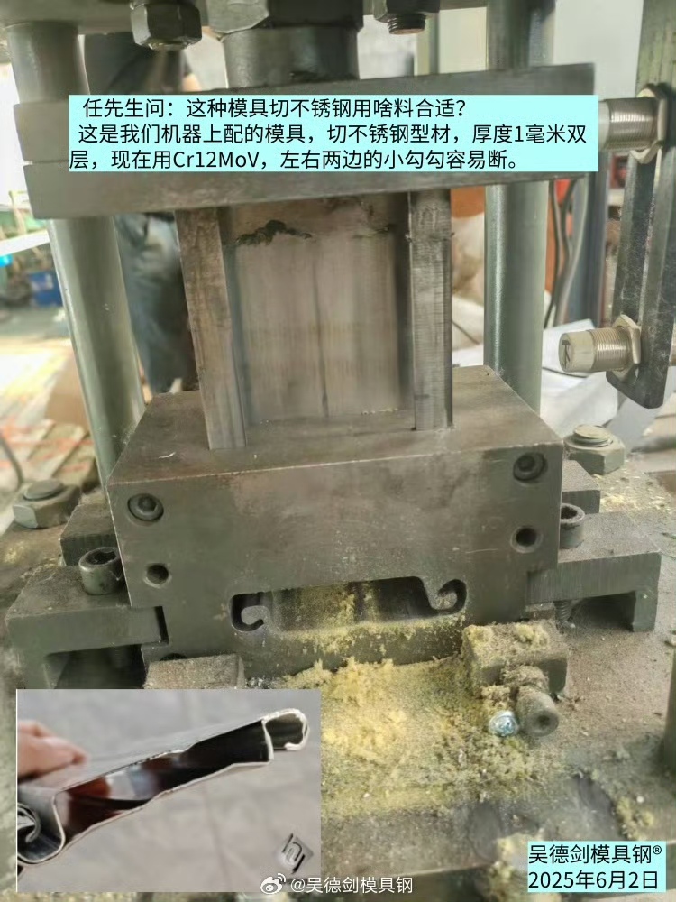 今早收到任先生咨询:这种模具切不锈钢用啥料合适?这是我们机器上配的模具,切不锈钢型材,厚度1毫米双层,现在用Cr12MoV,左右两边的小勾勾容易断。