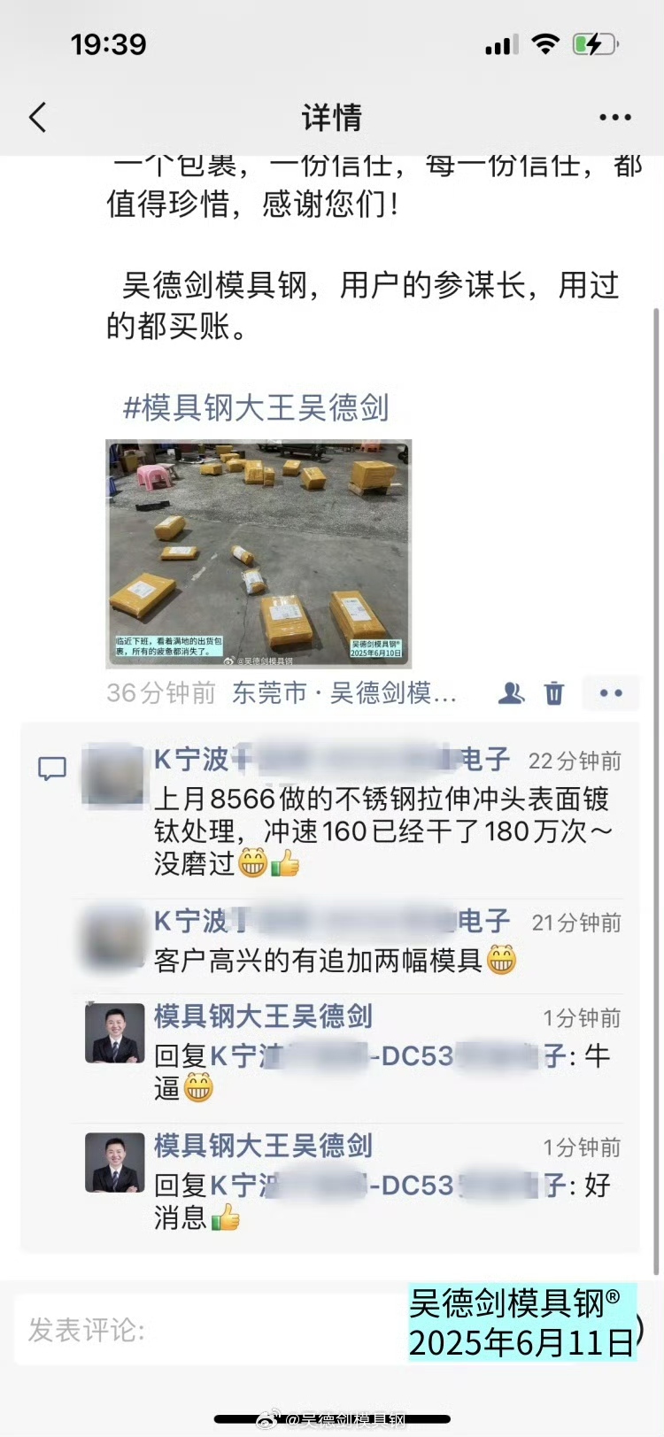 老客户余老板在朋友圈评论说:上月8566做的不锈钢拉伸冲头加表面镀钛处理,冲速160,已经干了180万次,没磨过,高兴的客户又追加两幅模具。