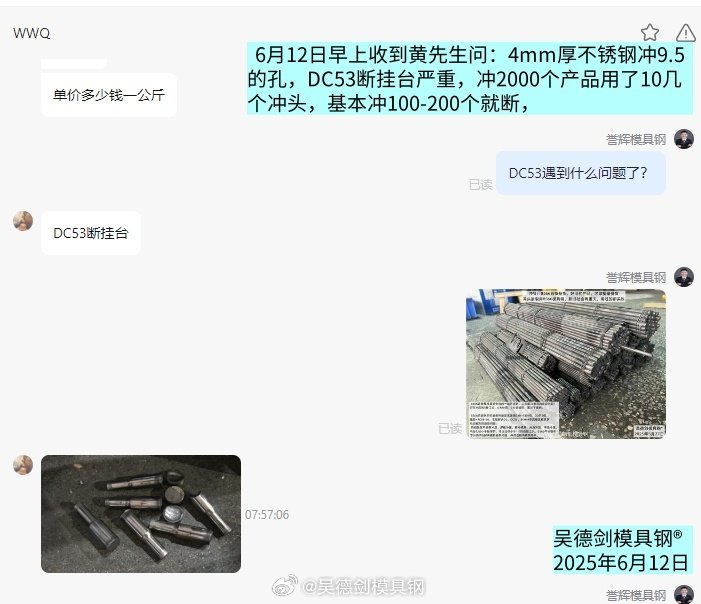 今早上班路上,又收到黄先生咨询,4mm厚不锈钢冲9.5的孔,DC53断挂台严重,冲2000个产品用了10几个冲头,基本冲100-200个就断。