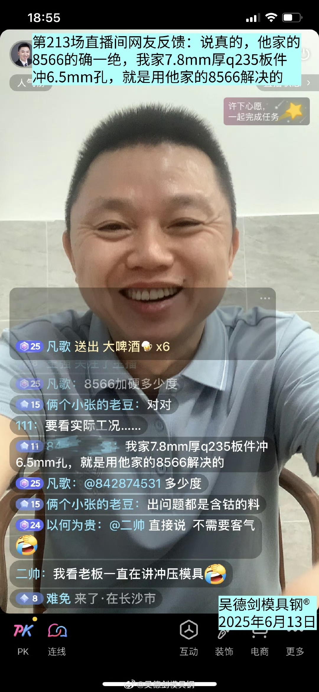 第213场直播间网友反馈:“说真的,他家的8566的确一绝,我家7.8mm厚q235板件冲6.5mm孔,就是用他家的8566解决的。”
