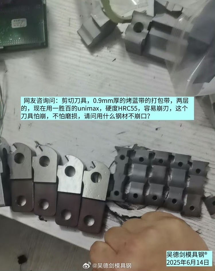 网友咨询问:剪切刀具,0.9mm厚的烤蓝带的打包带,两层的,现在用一胜百的unimax,硬度HRC55,容易崩刃,这个刀具怕崩,不怕磨损,请问用什么钢材不崩口?
