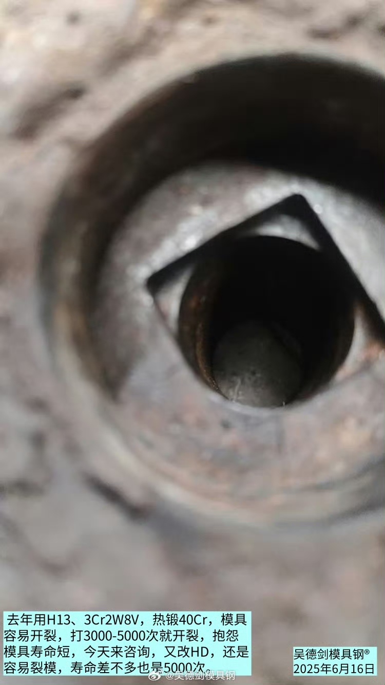 今天又来咨询,现在模具用料改成HD,还是容易裂模,寿命差不多也是5000次,问要用什么模具钢?