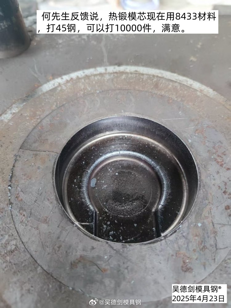 沈先生去年用H13、3Cr2W8V,热锻40Cr,模具容易开裂,打3000-5000次就开裂,抱怨模具寿命短。当时推荐他用耐热钢8433,8433模具钢的耐热及稳定性是H13的2-3倍,硬度HRC50-54;以提高模具钢的耐热性能及批疲劳性能,减少模具开裂和塌模,从而延长模具寿命。