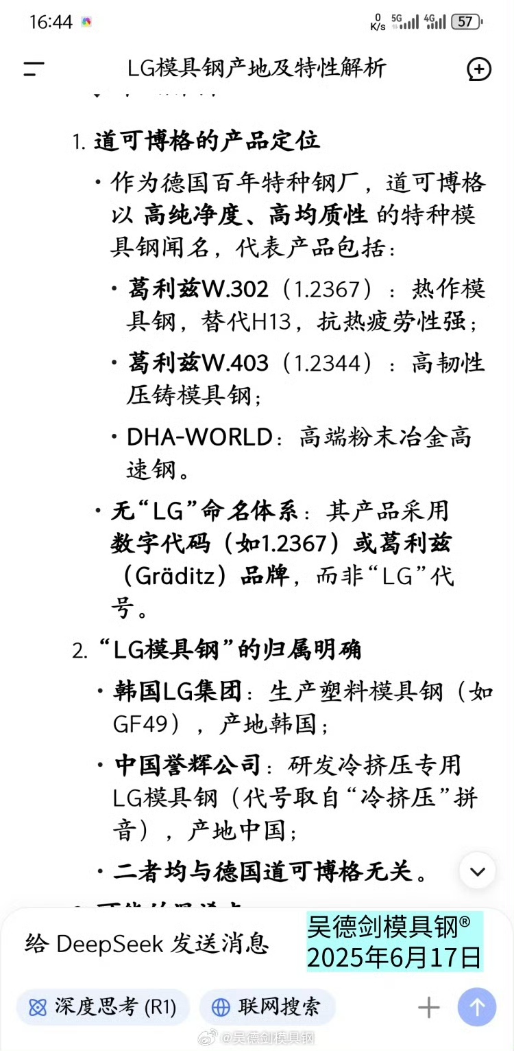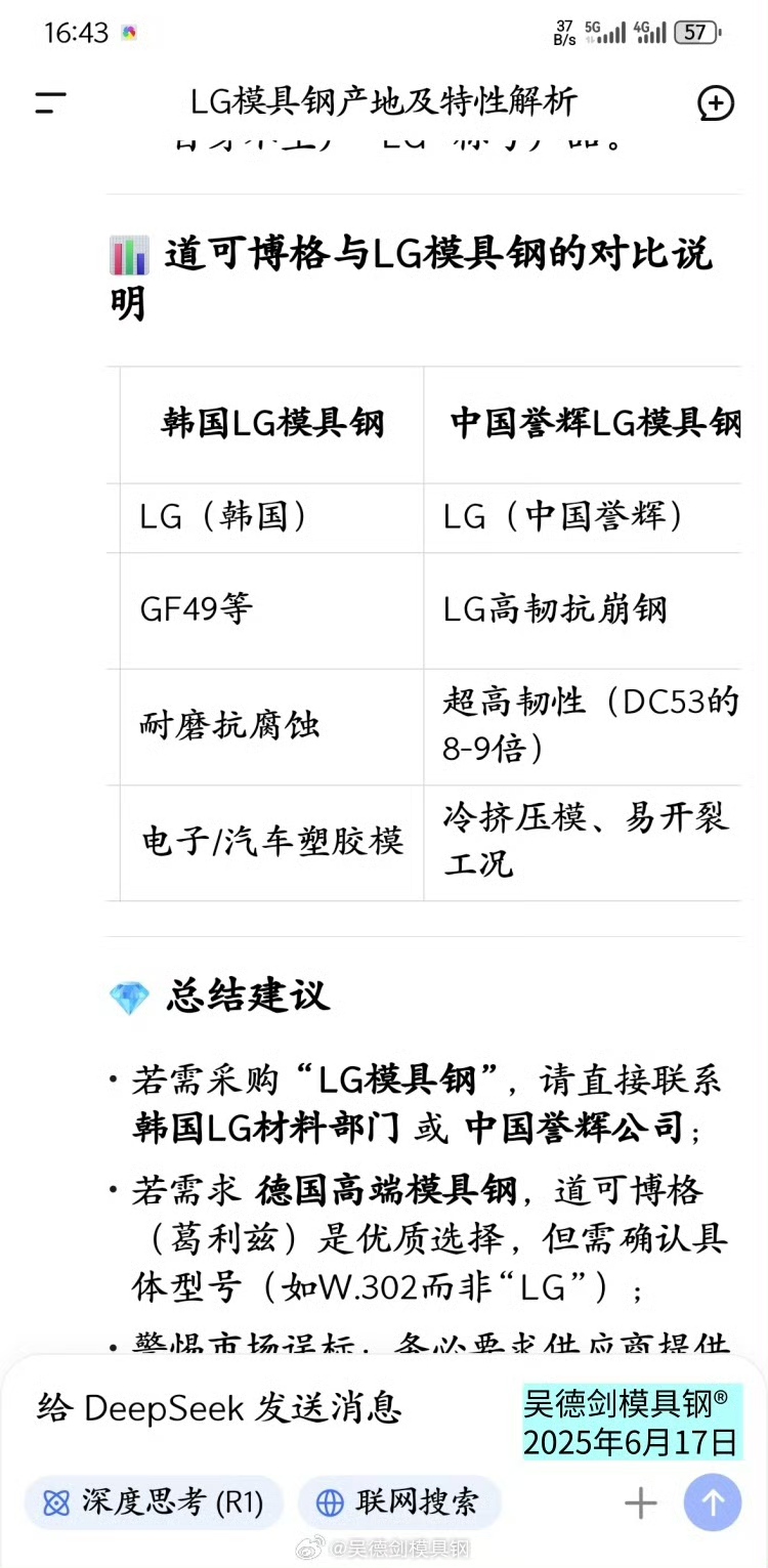 客户给我发来两张截图,这是他用Deep seeK,AI深度探索,求得的答案。 总结建议:若需采购“LG模具钢”,请直接联系中国誉辉公司。