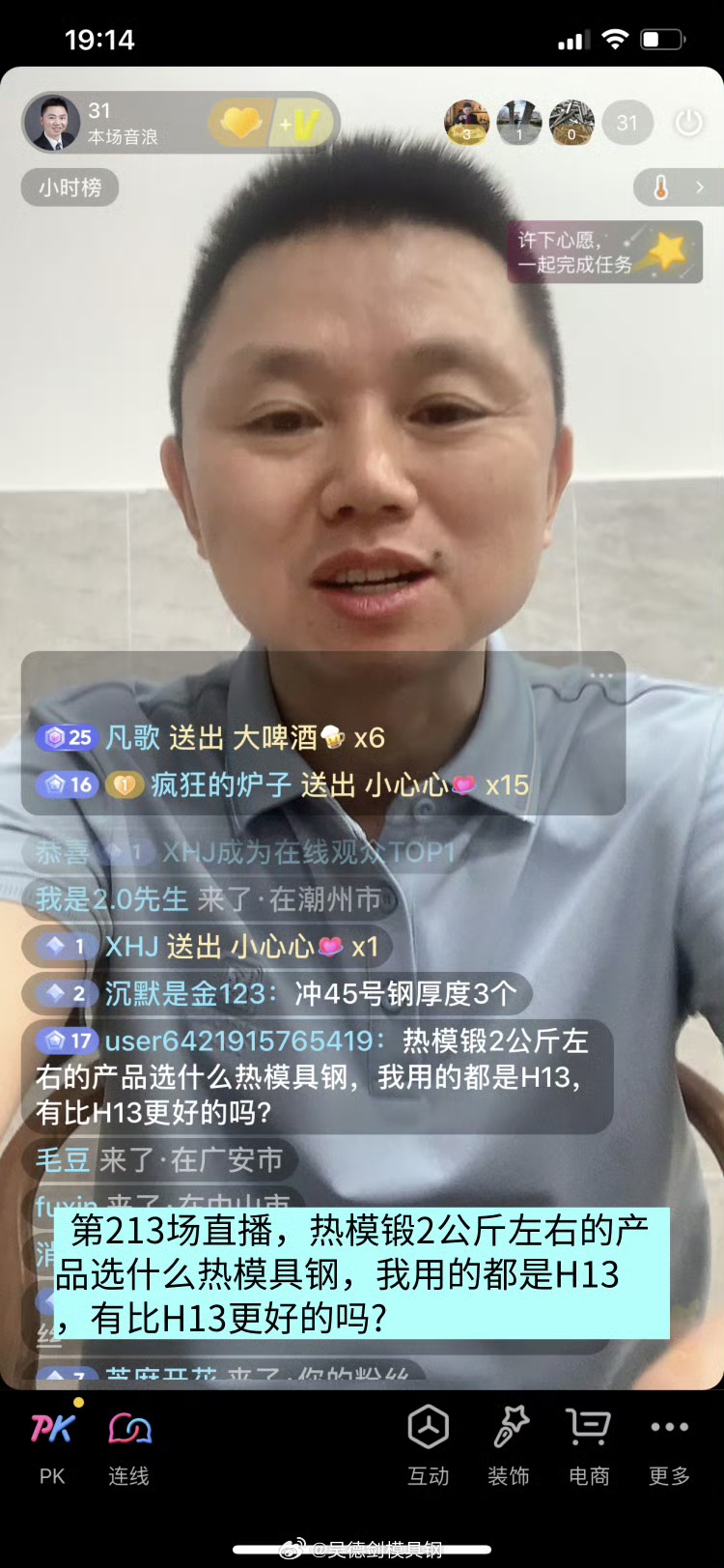 第213场直播间,有网友提问:热模锻2公斤左右的产品选什么热模具钢,我用的都是H13,有比H13更好的吗?