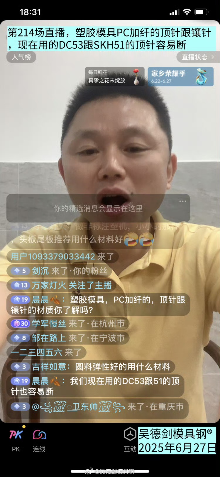 第214场直播间网友提问:塑胶模具PC加纤的顶针跟镶针要用什么材料,现在用的DC53跟SKH51的顶针容易断。