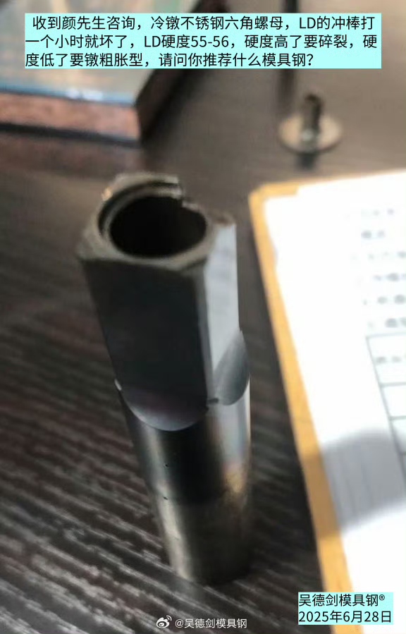 收到颜先生咨询,冷镦不锈钢六角螺母,LD的冲棒打一个小时就坏了,LD硬度55-56,硬度高了要碎裂,硬度低了要镦粗胀型,请问你推荐什么模具钢?
