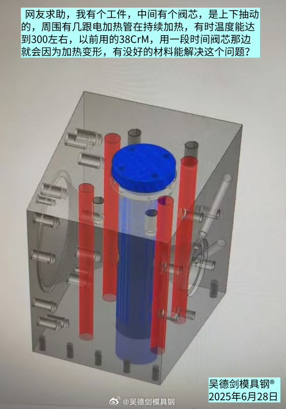 网友求助,我有个工件,中间有个阀芯,是上下抽动的,周围有几跟电加热管在持续加热,有时温度能达到300左右,以前用的38CrM,用一段时间阀芯那边就会因为加热变形,有没好的材料能解决这个问题?