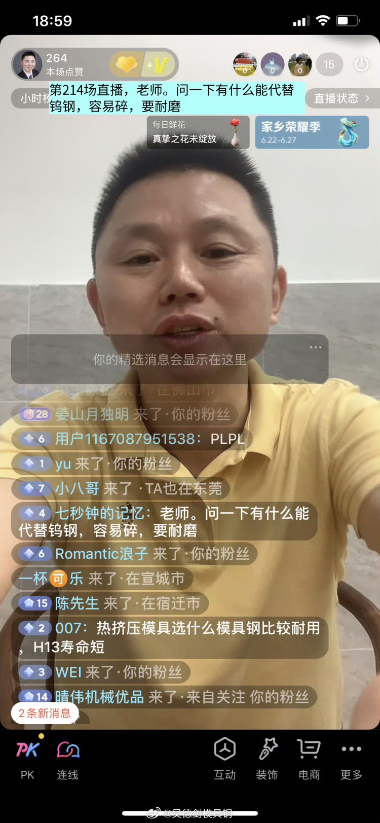 第214场直播,网友七秒钟的记忆问我,老师。问一下有什么能代替钨钢,容易碎,要耐磨。