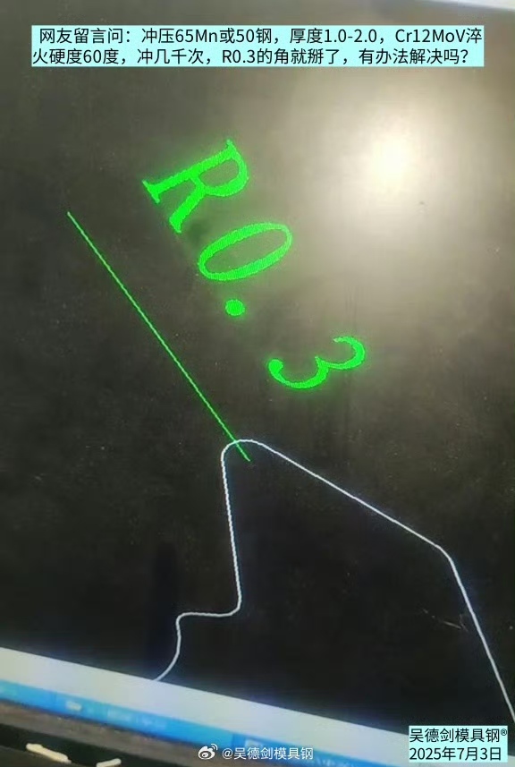 网友留言问:冲压65Mn或50钢,厚度1.0-2.0,Cr12MoV淬火硬度60度,冲几千次,R0.3的角就掰了,有办法解决吗?