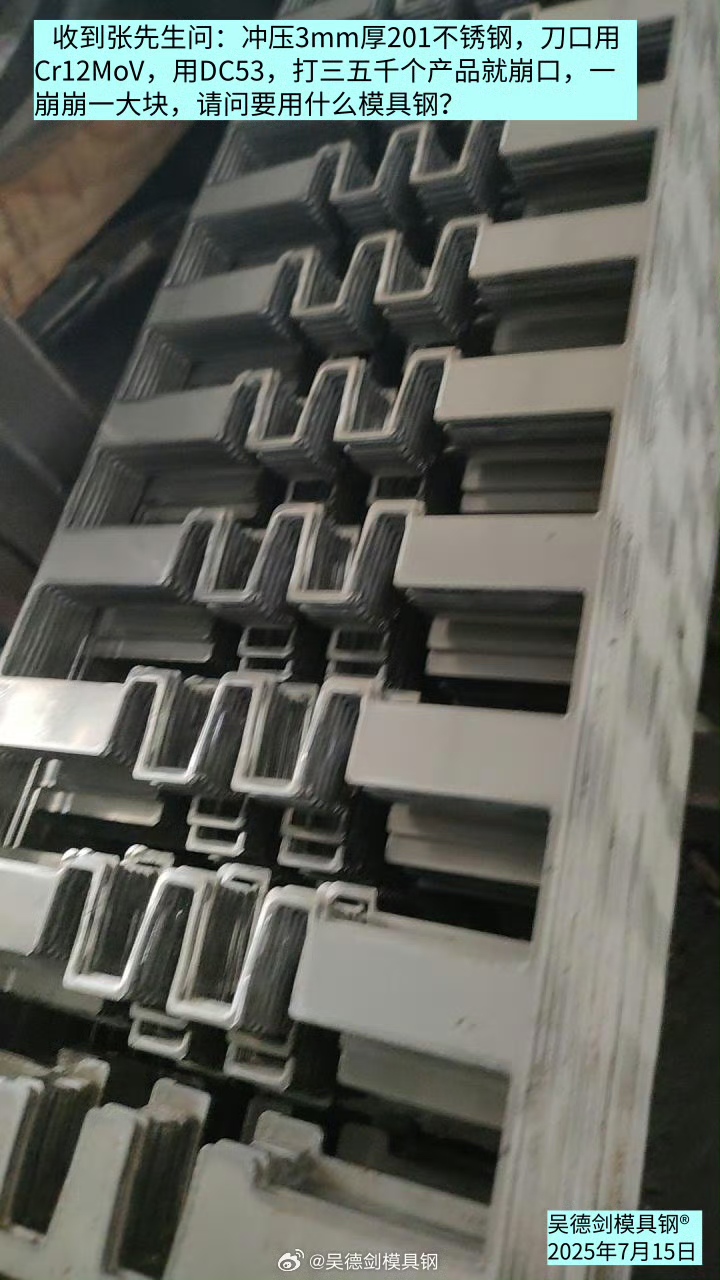 收到张先生问:冲压3mm厚201不锈钢,刀口用Cr12MoV,用DC53,打三五千个产品就崩口,一崩崩一大块,请问要用什么模具钢?