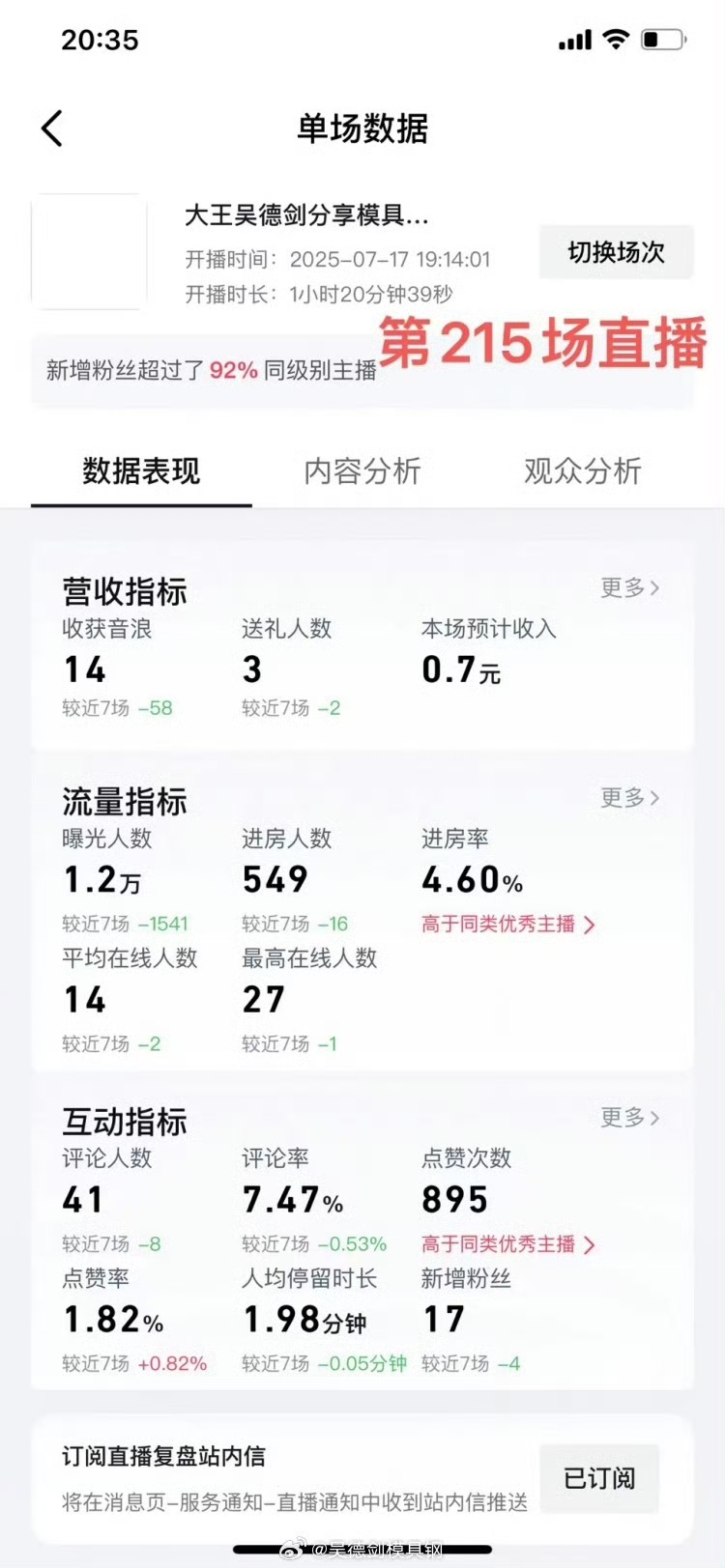 2025年7月17晚,我做了1小时20分的直播,这是我的第215场直播。