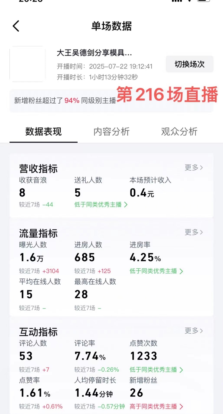 2025年7月22日晚,我做了1小时直播,这是我的第216场直播。