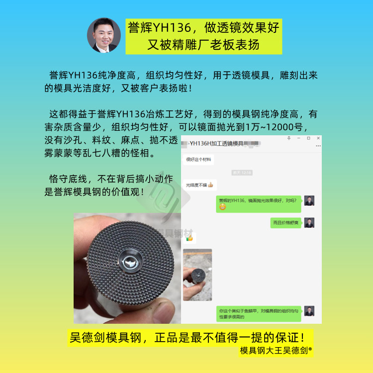 誉辉YH136冶炼质量好,纯净度高,5大有害杂质含量少,又经过六面锻造,三锻三拔,组织均匀性好,可以镜面抛光到1万~12000号,没有沙眼、麻点、料纹、抛不透、雾蒙蒙等怪相,被精雕厂老板表扬,雕刻出来的光光亮,做透镜效果好。