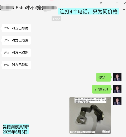 他告诉我说:冲压2.7厚201不锈钢,现在在宁波当地买的97块钱一公斤的8566,上去就崩了,产品冲不出来,现在客户追货追到厂里来了。