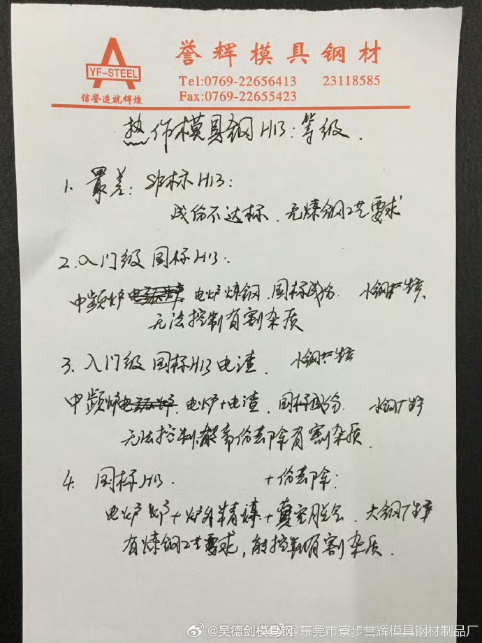 可实际上,H13至少有6个等级,刚刚看到2017年12月14日发的微博,关于H13的冶炼等级分析,我感觉分得挺好。