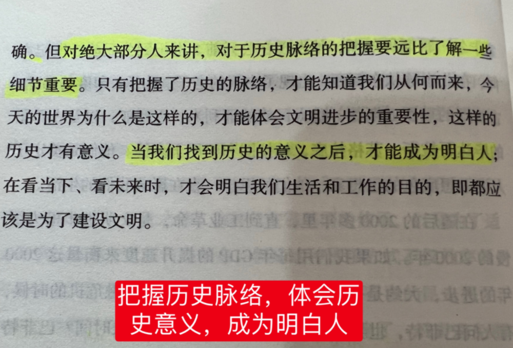 对绝大部分人来讲,对于历史脉络的把握要远比了解一些细节重要。只有把握了历史的脉络,才能知道我们从何而来,今天的世界为什么是这样的,才能体会文明进步的重要性,这样的历史才有意义。当我们找到历史的意义之后,才能成为明白人。