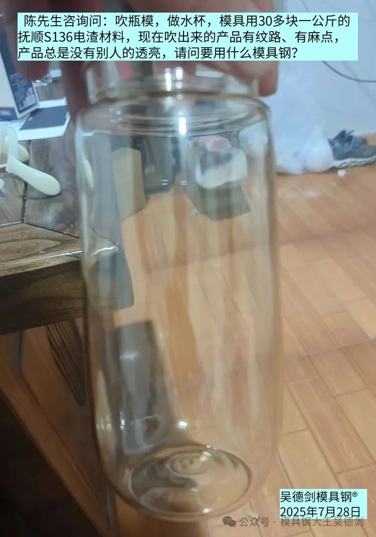 陈先生咨询问:吹瓶模,做水杯,模具用30多块一公斤的抚顺S136电渣材料,现在吹出来的产品有纹路、有麻点,产品总是没有别人的透亮,请问要用什么模具钢?