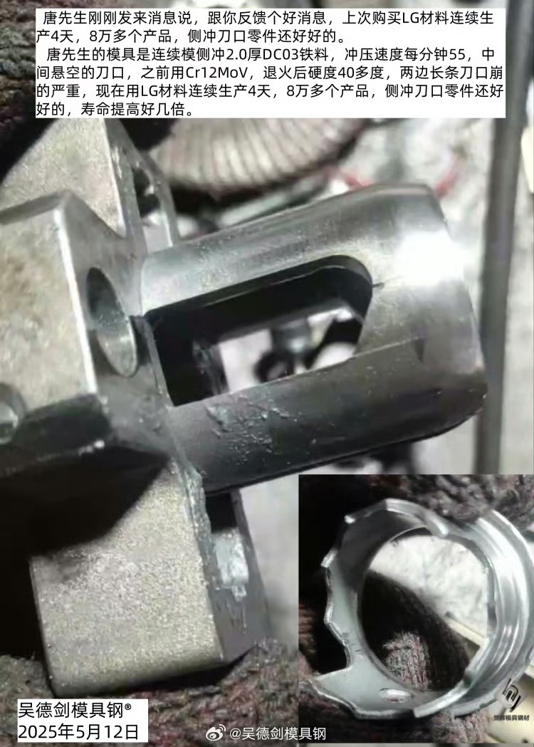 唐先生的模具是连续模侧冲2.0厚DC03铁料,中间悬空的刀口,之前用Cr12MoV,退火后硬度40多度,两边长条刀口崩的严重,现在用LG材料,连续生产4天,冲压了8万多个产品,侧冲刀口零件还好好的,寿命提高好几倍。