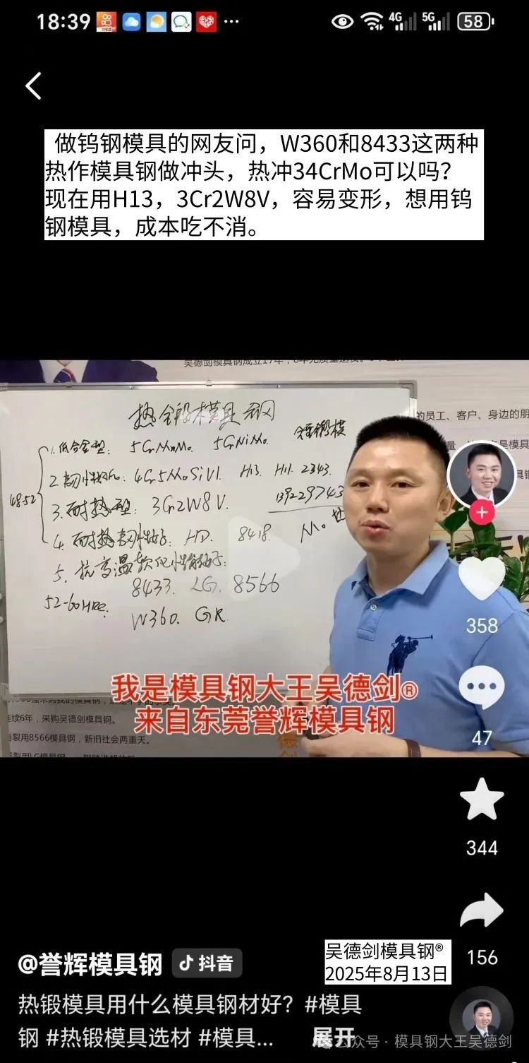 但如果产品数量多的,现在的冲头寿命太短的,容易变形的,那就不想了,客户现在想用W360和耐热钢8433做冲头,我只能说比H13和3Cr2W8V强,但不是理想选材。
