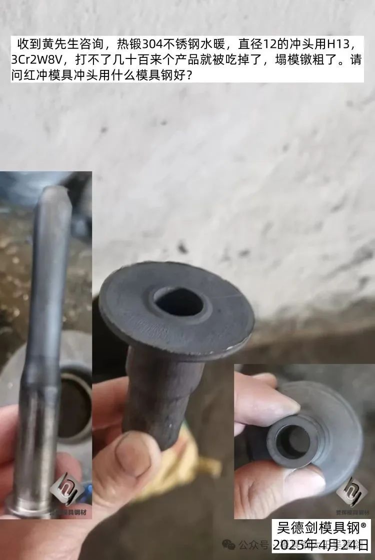 细聊后得知,客户热锻34CrMo材质,工件温度加热到1200℃,原来冲头用H13,Cr12MoV,冲头容易变形,想用钨钢模具,成本又吃不消,现在想着换成W360或耐热钢8433,但拿捏不准,想问一下用料是否可以?