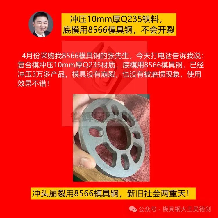 同样是冲压10mm厚的盘扣产品,我们张先生原先用DC53,也是一崩要崩3-5mm,硬度调低到54-56HRC也没用,模具寿命从没超过5000次,但用8566防崩钢后,模具就不再崩裂,一次冲压3万多产品,也不磨损。