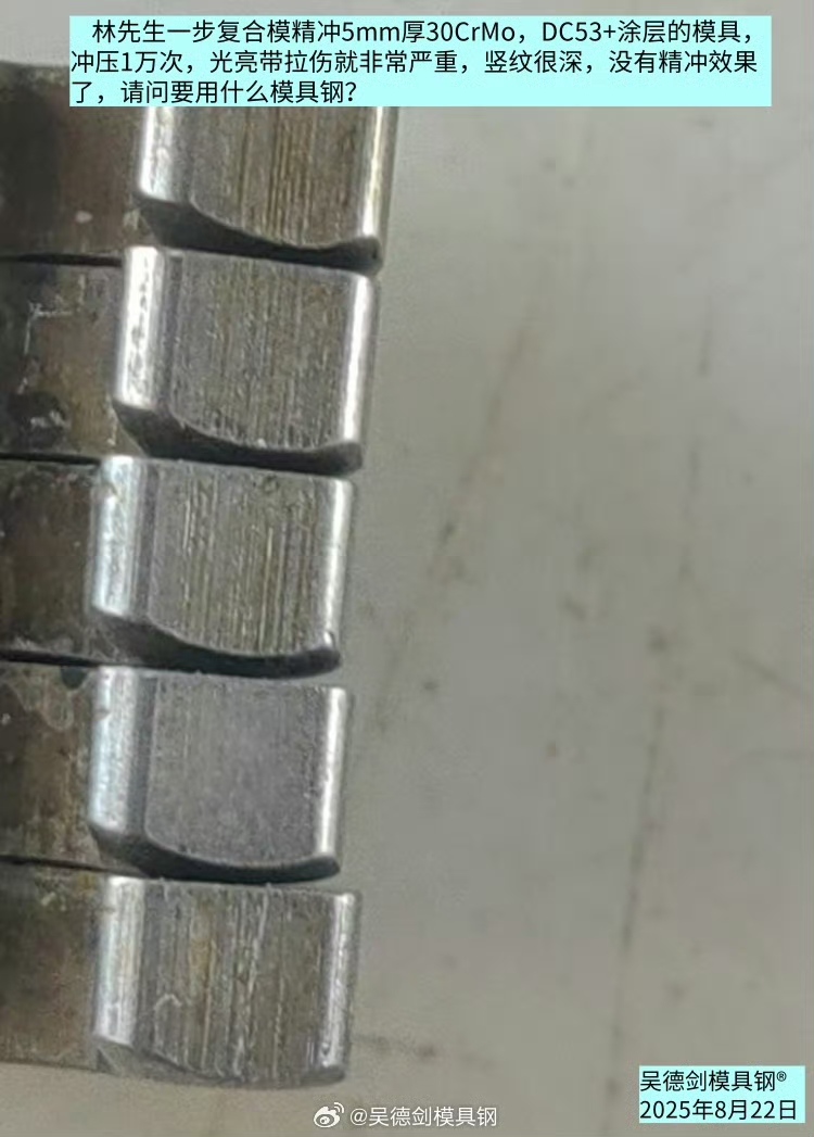 林先生一步复合模精冲5mm厚30CrMo,DC53+涂层的模具,冲压1万次,光亮带拉伤就非常严重,竖纹很深,没有精冲效果了,问我要用什么模具钢?