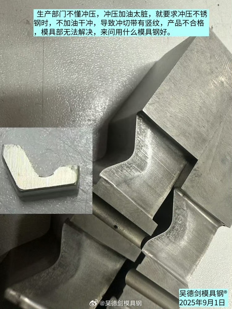 今早收到一个咨询,冲压不锈钢,模具容易粘料,冲切带有竖纹,问要用什么模具钢解决?