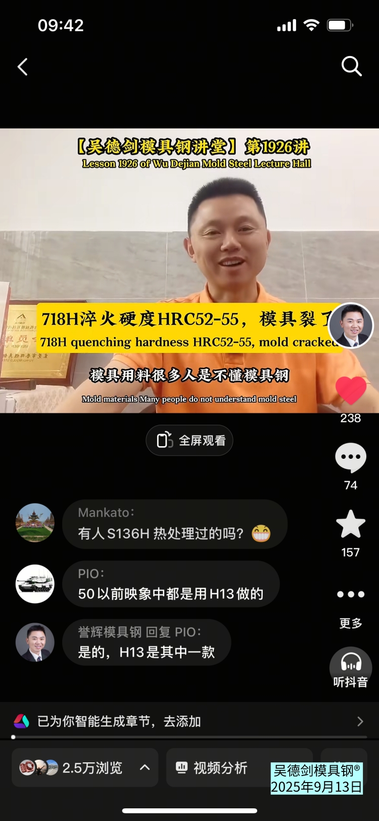 第1926视频,是讲一位粉丝注塑PA6+30%玻纤的增强塑料模,用的是718H模具钢,要求热处理厂把硬度做到HRC52-55,但是模具在加工的过程当中就裂了,问是热处理的问题,还是材料的问题?