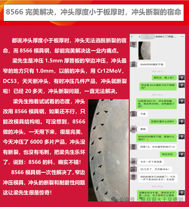 梁先生的冲头厚度1.0,小于板材厚,1.5mm,冲头比例小于1:1,工况更恶劣,冲头更容易崩断,但用8566防崩钢做的冲头,一天用下来,冲压了 6000 多片产品,冲头没有断裂的情况,也没有毛刺,很是完美。梁先生高兴地说:8566 的料,确实不错! 确实也是,原来天天断冲头,冲几件就断,现在冲压了一整天,冲了6000片产品,没有断过冲头,这差距,就是新旧社会两重天呀,换谁都高兴,冲头不坏,冲床一直开,钞票哗啦啦的来,不用换冲头,人还不累,梁先生确实应该高兴。
