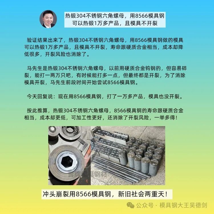 马先生是热锻304不锈钢螺母的,原来的模具用硬质合金,容易碎裂,能打一万多两万产品,有时能打多一点,但最终都是碎裂。 为了解决模具碎裂问题,马先生尝试用8566模具钢。