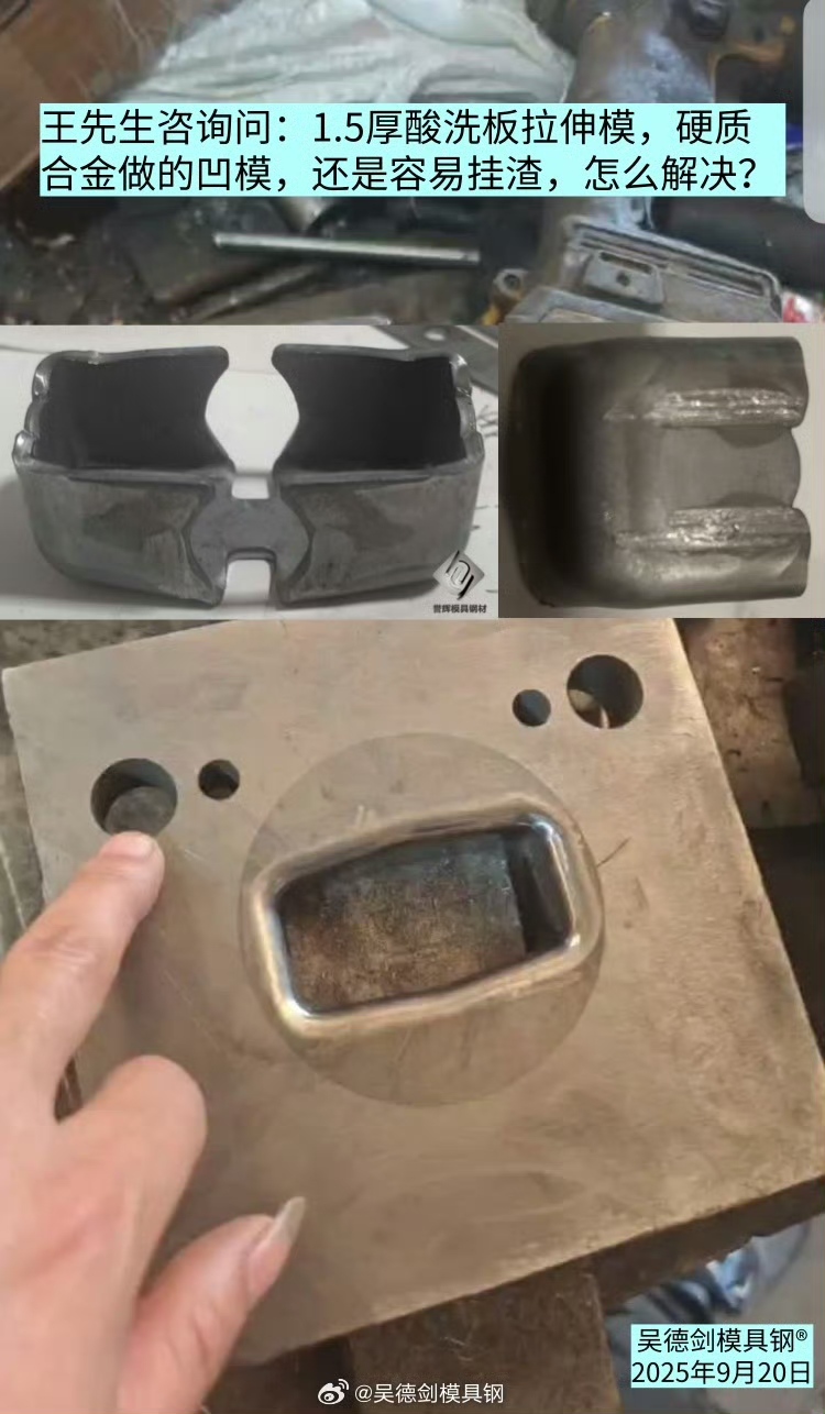 王先生咨询问:1.5厚酸洗板拉伸模,硬质合金钨钢做的凹模,还是容易挂渣,怎么解决?