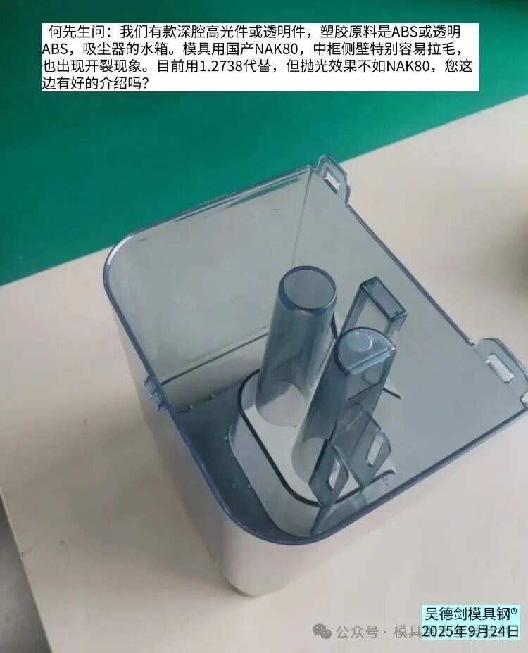 何先生问:我们有款深腔高光件或透明件,塑胶原料是ABS或透明ABS,吸尘器的水箱。模具用国产NAK80,中框侧壁特别容易拉毛,也出现开裂现象。目前用1.2738代替,但抛光效果不如NAK80,您这边有好的介绍吗?
