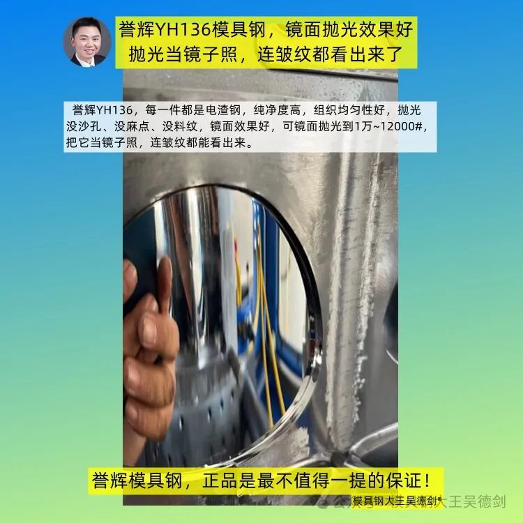 誉辉YH136是一款电渣重熔的不锈钢,又经过六面锻造,三锻三拔,得到的模具钢纯净度高,组织均匀性好,可以镜面抛光到1万-12000号,镜面抛光时无料纹、无麻点、抛光透亮,且可以淬火加硬到50HRC,高硬度保证高耐磨性,深腔脱模时,不会拖花拉毛,且用料成本跟NAK80差不多,是性能匹配,价格不贵的高性价比用料。