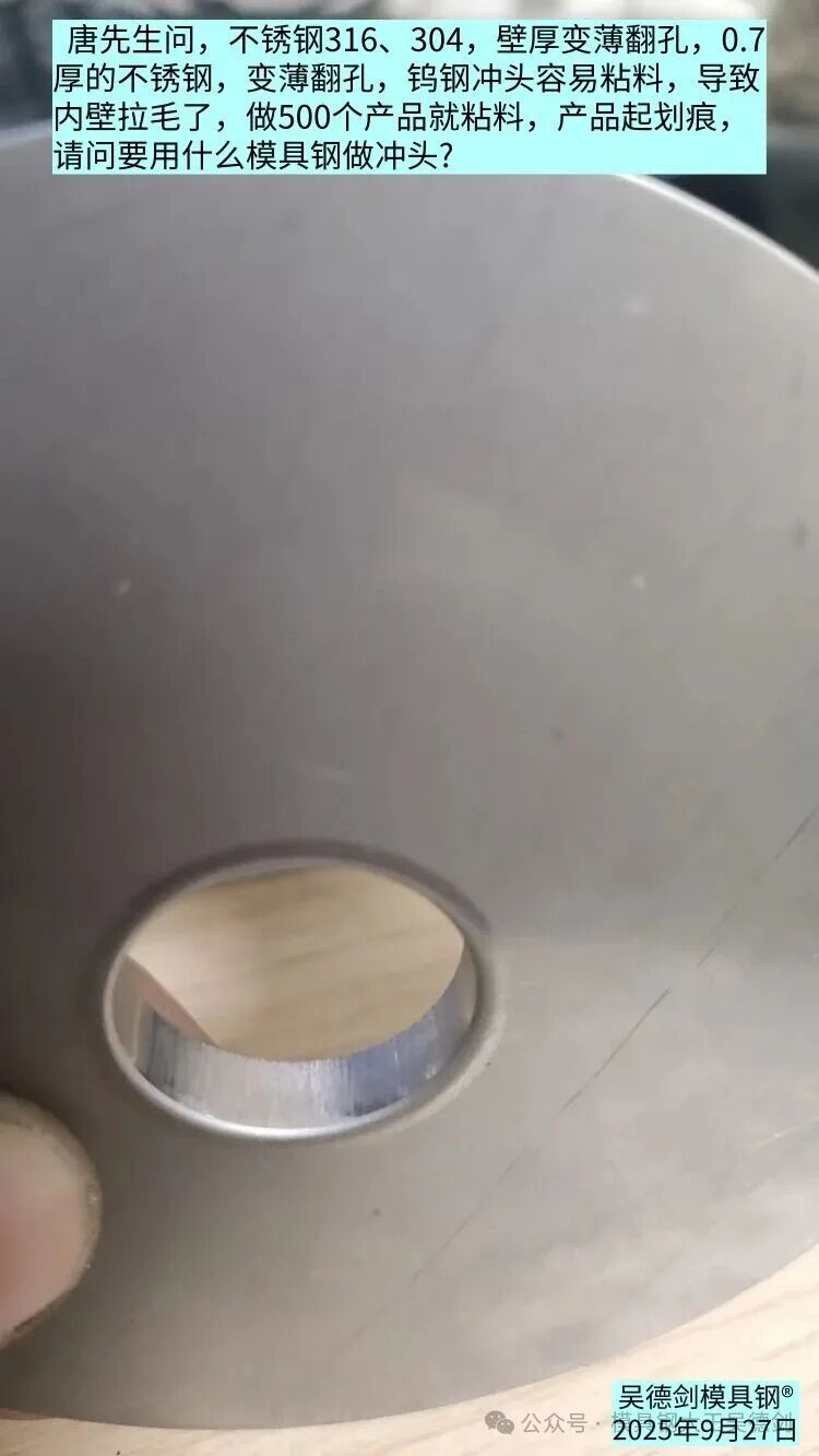进一步细聊后得知,0.7厚的不锈钢316、304,壁厚变薄翻孔,钨钢冲头容易粘料,导致内壁拉毛了,做500个产品就粘料,产品起划痕,做了一个SKH51的冲头,加了涂层的,出现粘料后,又做了一个钨钢冲头,都是这个情况,请问翻边冲头要用什么模具钢做冲头?