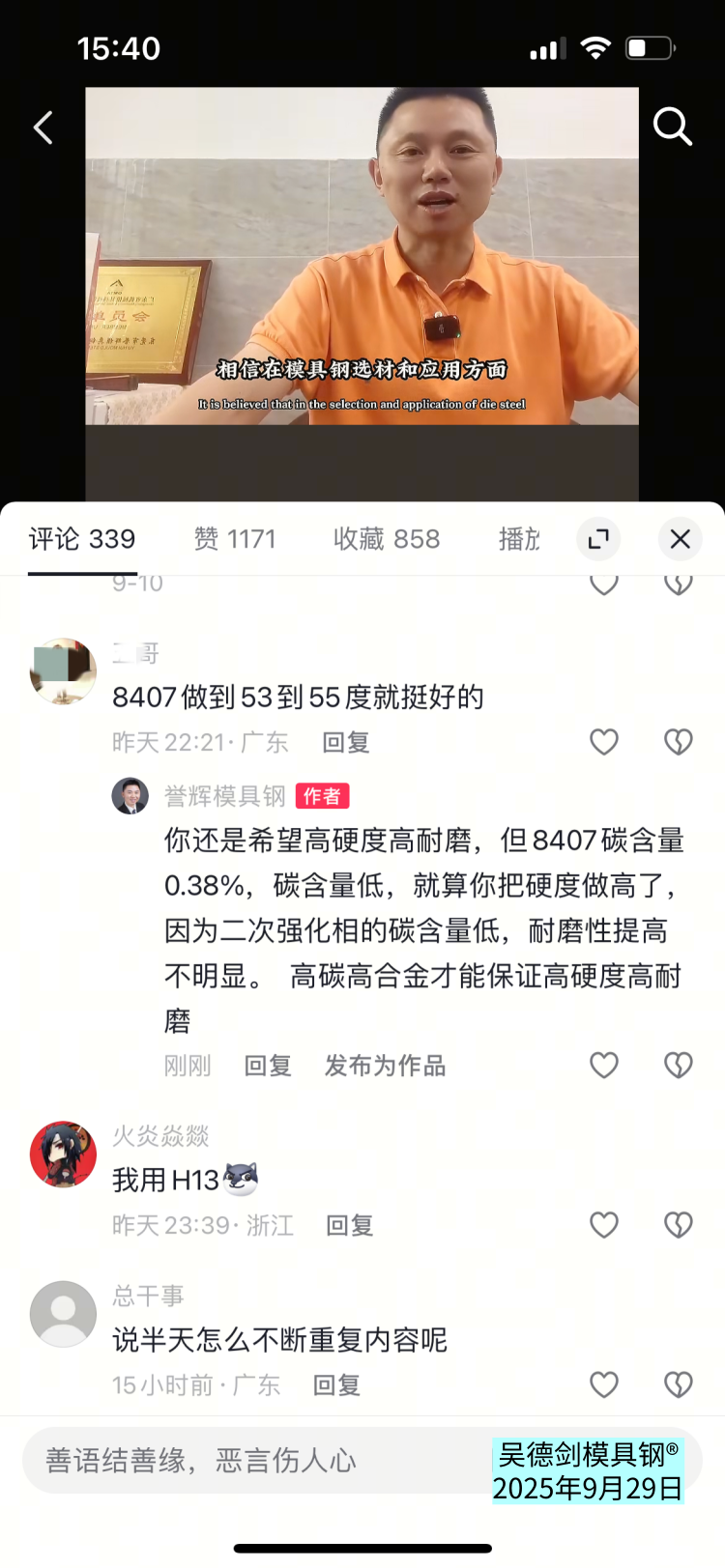 有网友在视频下面评论说,尼龙+30%玻纤的注塑模具,8407做到53到55度就挺好的。