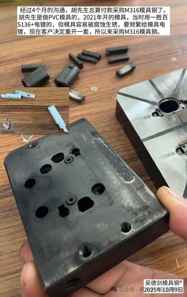 胡先生是做PVC模具的,2021年开的模具,当时用一胜百S136+电镀的,但模具容易被腐蚀生锈,要频繁给模具电镀,现在客户决定重开一套,所以来采购M316模具钢。