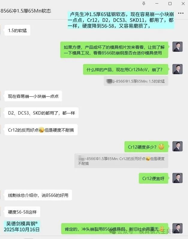 卢先生你冲压1.5厚65锰钢软料,现在用的4款模具钢,都是容易崩块的,你更应该尝试8566防崩钢。