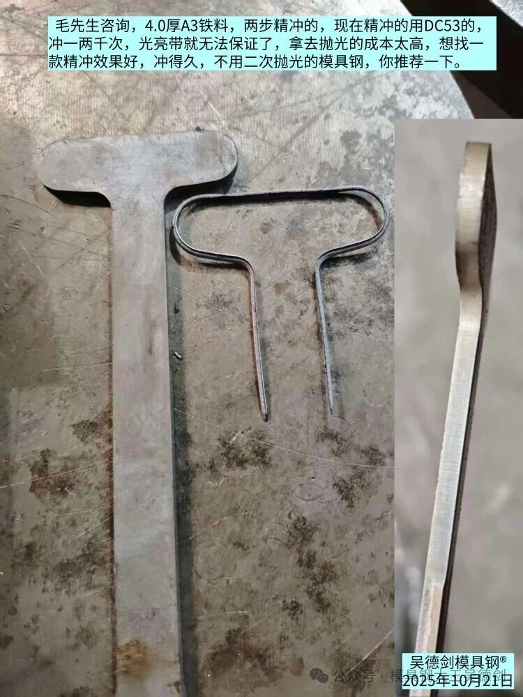 毛先生咨询,4.0厚A3铁料,两步精冲的,先粗冲落料,后精冲光亮带,但现在精冲的用DC53,冲一两千次,产品光亮带就无法保证了,拿去抛光的成本太高,想一款精冲效果好,冲得久,不用二次抛光的模具钢,你推荐一下。